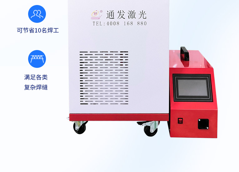 通發(fā)激光一體式手持式激光焊接機(jī),用手持式焊接槍替代以前固定光路,手拿焊接,靈活方便,焊接距離更長,克服工作臺空間的局限性,工件尺寸不統(tǒng)一時無法自動焊接的情況下使用。主要針對大型工件、固定位置如內(nèi)直角、外直角、平面焊縫焊接、焊接時熱影響區(qū)域小,變形小、而且焊接深度大,焊接牢固。是遠(yuǎn)距離焊接大工件的較為靈活的全新的焊接工藝。
